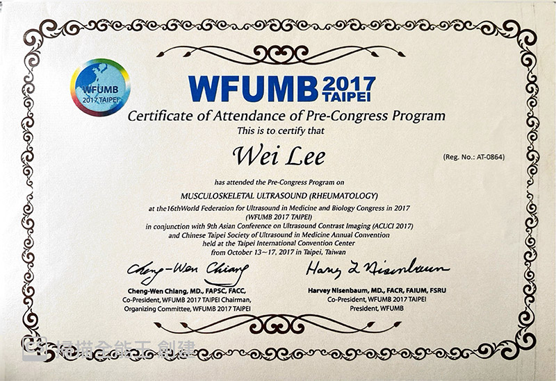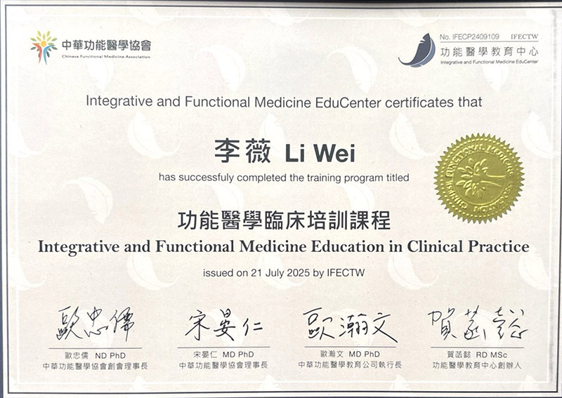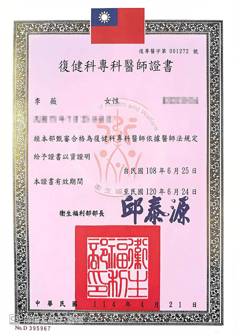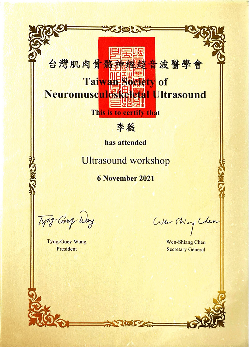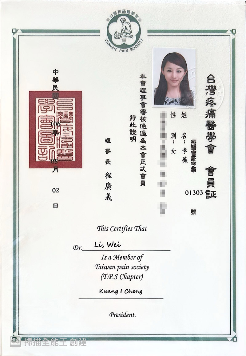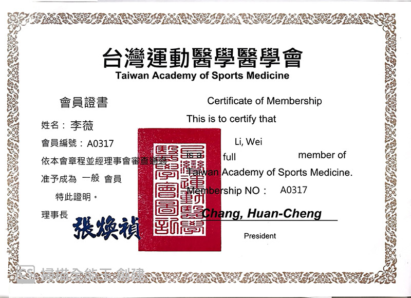 Our Team 醫療團隊 Our Team 醫療團隊 李薇 醫師 骨科疼痛修復治療專家李薇復健科醫師專精於急慢性疼痛管理、運動傷害修復及神經復健,擅長運用高階超音波導引進行精準注射,結合PRP再生醫學、增生療法與功能醫學,為患者制定全方位的組織修復計畫。同時擁有法國順勢醫學認證,並活躍於各大健康節目擔任專家來賓,致力於提供專業、精準且具溫度的醫療照護。 骨科疼痛修復治療專家李薇復健科醫師專精於急慢性疼痛管理、運動傷害修復及神經復健,擅長運用高階超音波導引進行精準注射,結合PRP再生醫學、增生療法與功能醫學,為患者制定全方位的組織修復計畫。同時擁有法國順勢醫學認證,並活躍於各大健康節目擔任專家來賓,致力於提供專業、精準且具溫度的醫療照護。 台北健立診所門診 台北健立門診掛號 主治項目 疼痛治療PRP增生治療及再生治療超音波導引疼痛阻斷神經解套術膝蓋及髖關節退化運動傷害(高爾夫球肘、網球肘)下背痛五十肩椎間盤突出腕隧道症候群板機指/媽媽手坐骨神經痛醫學美容 經歷 台北醫學大學附設醫院總醫師台北醫學大學附設醫院復健專科醫師台灣疼痛醫學會會員台灣神經復健醫學會會員台灣復健醫學會會員台灣增生醫學會會員台灣骨骼肌肉神經超音波醫學會會員台灣運動醫學會中華民國美容醫學會會員台灣微整形學會會員 Certificates Case 成功案例經驗分享 健立醫療堅持醫療專業與品質 把關優良的服務品質 Read More EECP體外反搏療程 × 林小姐的健康逆轉記 綜合格鬥亞錦賽國手金牌余至誠|如何戰勝運動傷害? Emma 的減重逆轉勝故事:甩掉 20 公斤,找回健康與自信! 誰適合胃肉毒? 別讓落枕成為你旅行的惡夢