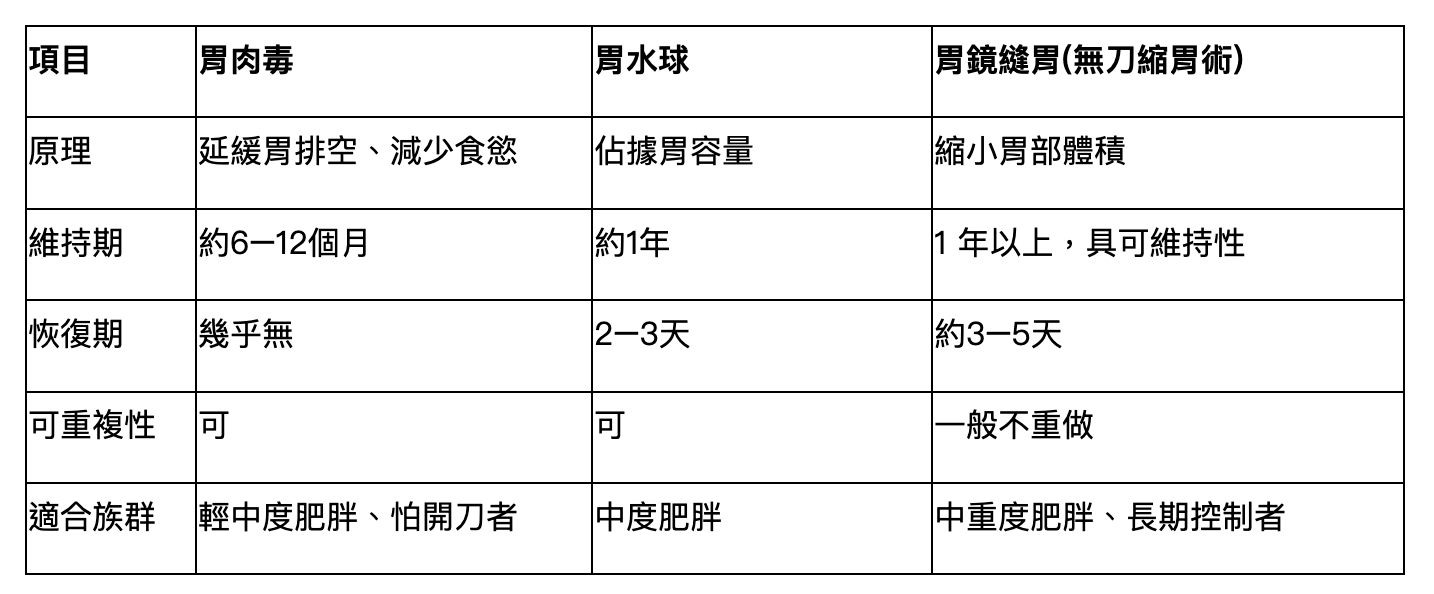 胃鏡減重療程比較表